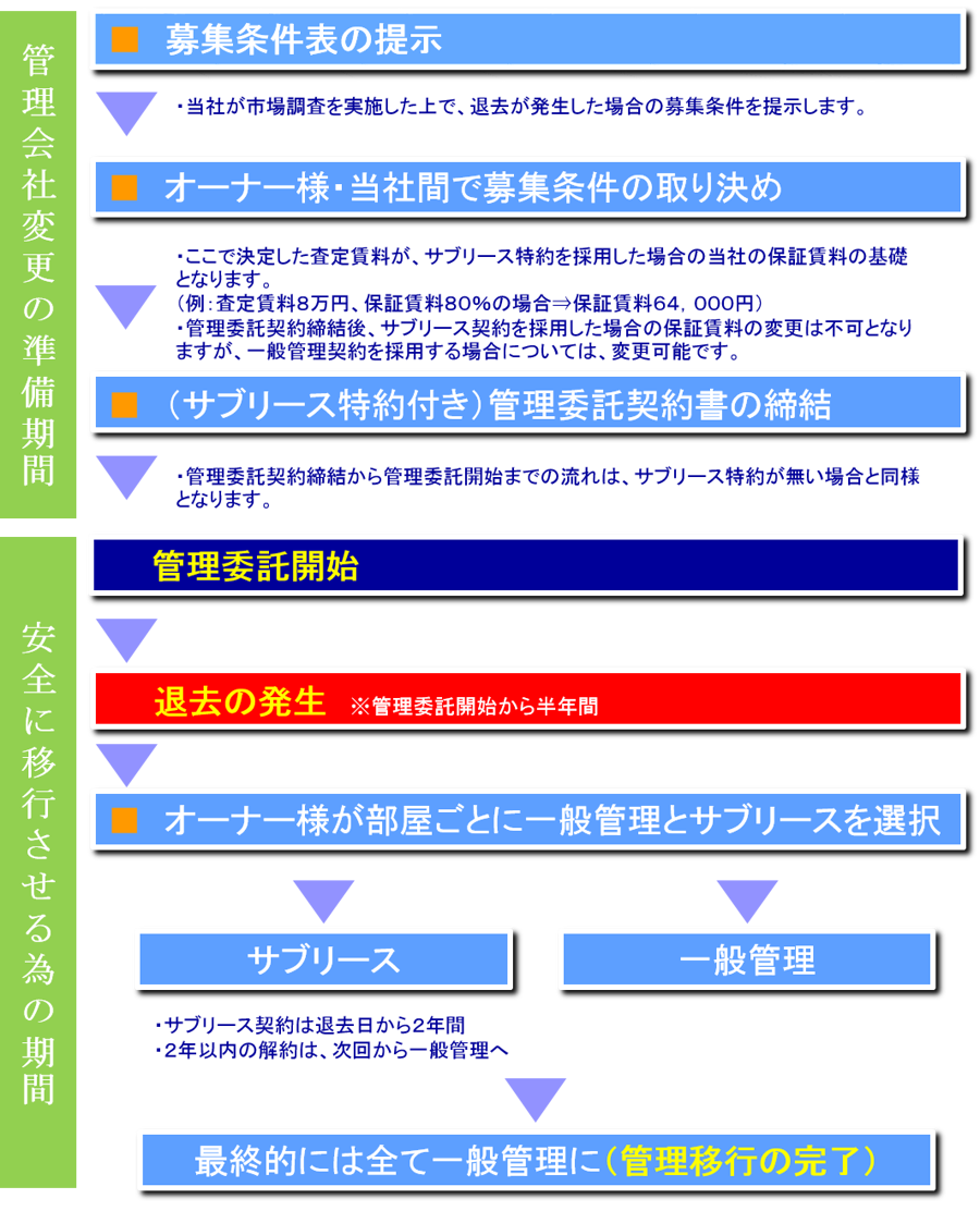 ・サブリース期間は、退去日から2年間となり、2年経過後は一般管理に移行する。
